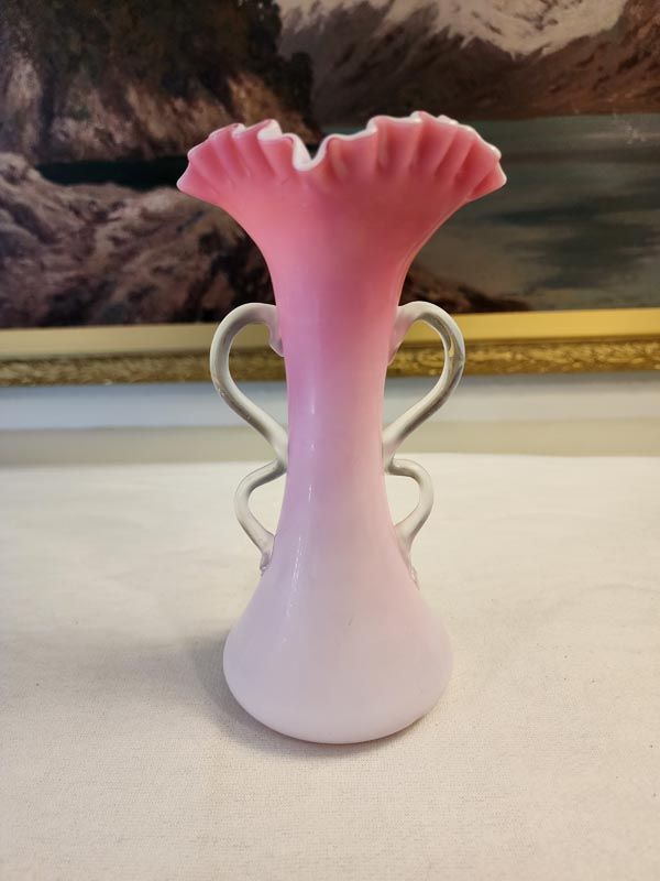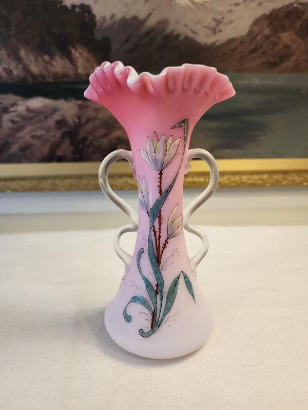 A nice example of a pink over white cased hand blown glass vase with ruffled top, twin handles and nice enamel scene of flowers.