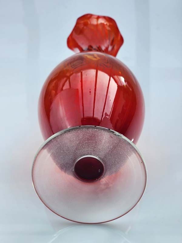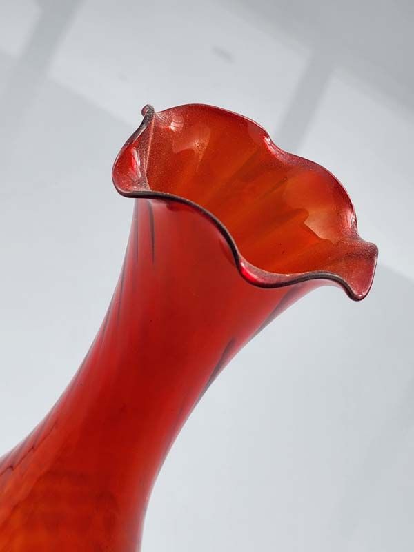A nice retro red and orange glass vase with ruffled edge.