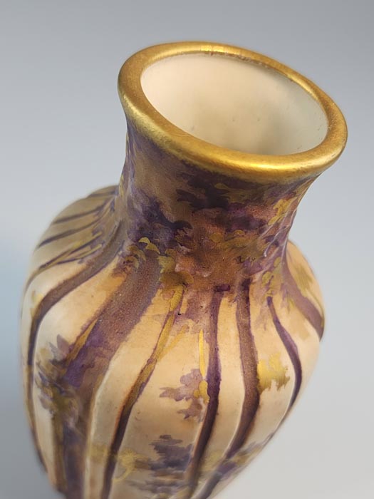 We have the privilege to offer you this absolutely gorgeous amphora vase with a woodland scene of trees (continuous forest) in shallow relief decorated with gilt and purple.