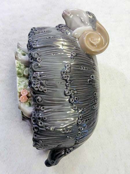 A Lladró brand porcelain figurine entitled Ram in the Meadow. This figurine, hand made in Spain introduced 2009, depicts a Ram standing in a meadow with flowers.