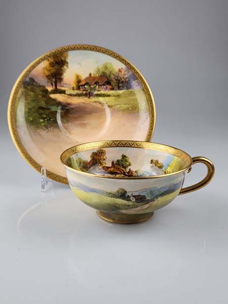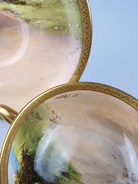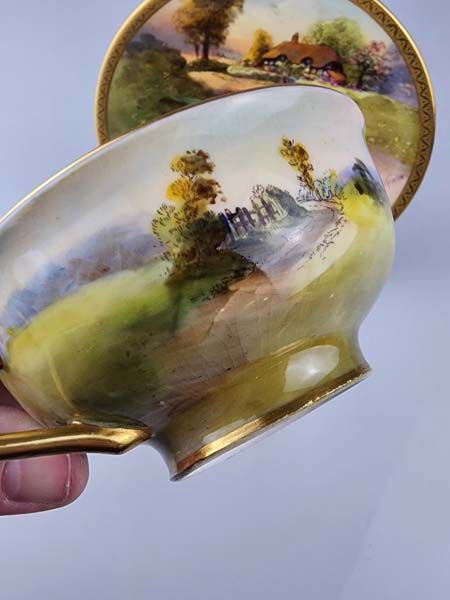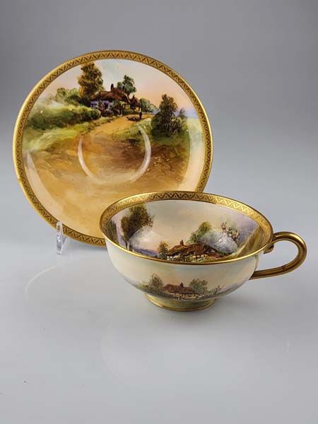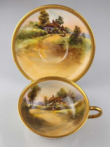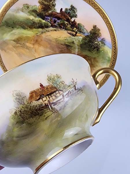 A collectable Royal Worcester Villiage Cottage scene porcelain cups and saucers of various locations and by various artists.