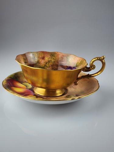 A nice Royal Worcester porcelain Duo: cups and saucer with hand painted fallen fruit pattern, signed Harry Ayrton (cup), and Edward Townsend (saucer)