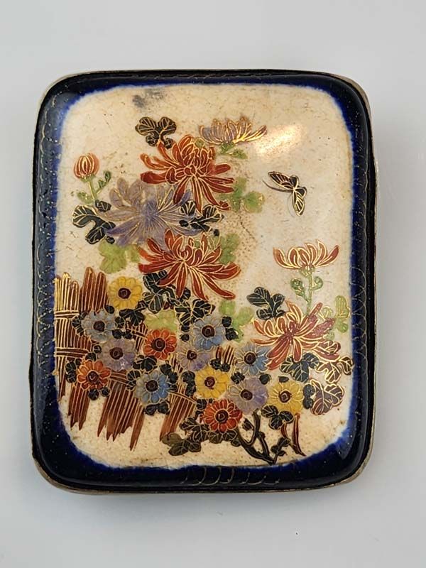 A nice Satsuma buckle decorated with a floral scene with butterfly, all surrounded by a deep navy blue border.