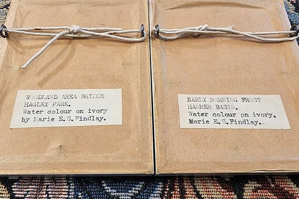 A nice grouping of two water colour paintings on ivory by Marie E. S. Findlay. Titled to the reverse (1) Woodland Area Bridge Hagley Park, (2) Early Morning Frost Hanmer Basin.