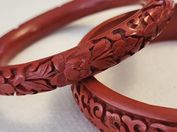 Two stylish vintage Chinese Cinnabar bangles. 6.5-7.25cm internal diameter.
