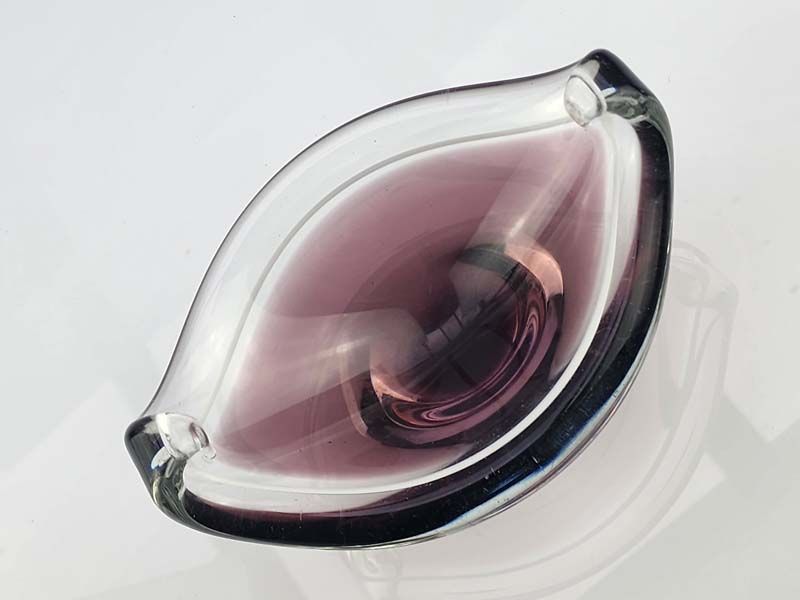 A smokey amethyst coloured art glass bowl with white inner pinstripe.