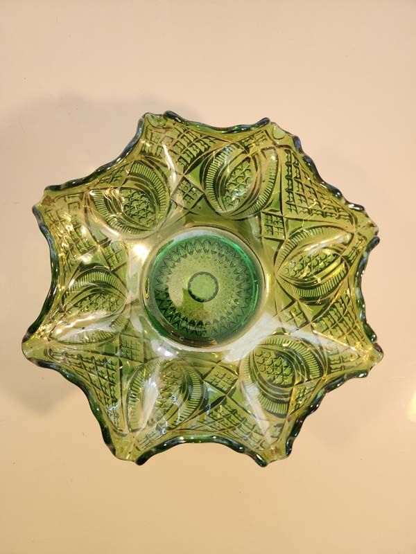 A lovely coloured large bowl, in green with silver iridescent colour way with diamond ring pattern.