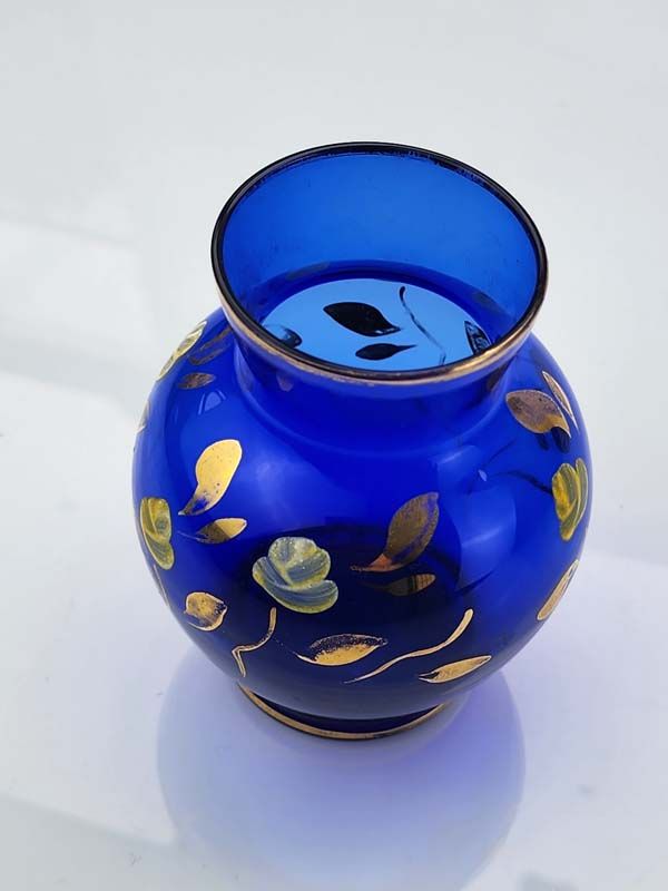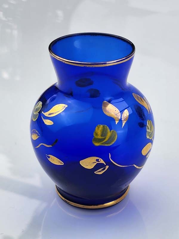 A vintage cobalt blue Venetian glass vase with gilt and enable flower decoration.