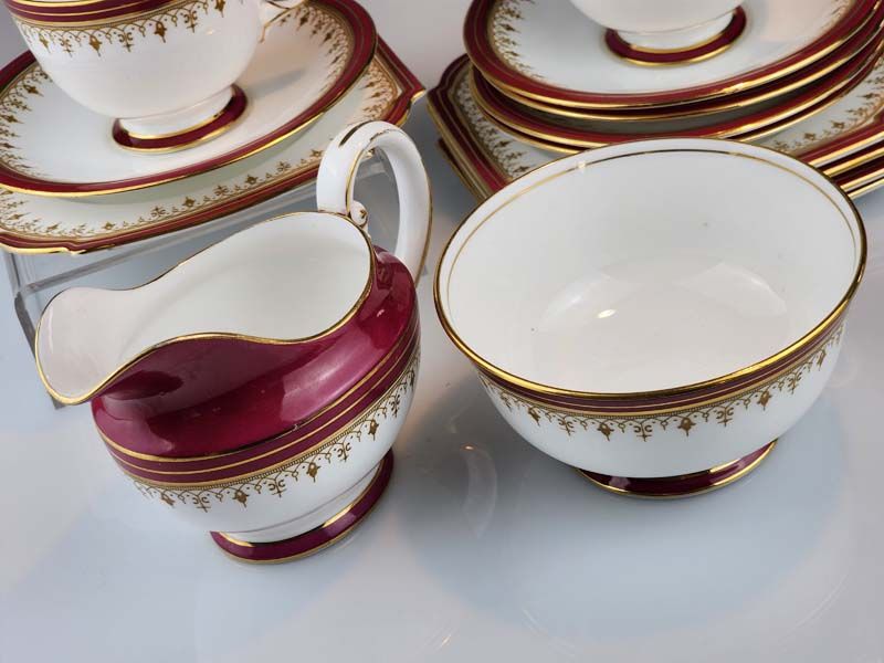 A nice Aynsley tea set with maroon and gilt decoration. 4x trios, an open sugar bowl and creamer.