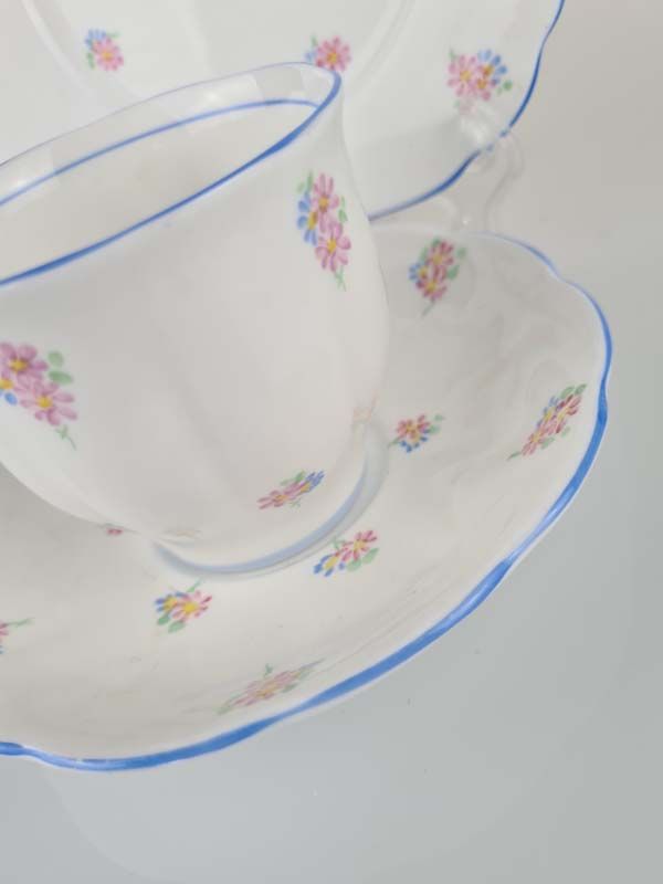 The trio is decorated with pink flowers, blue leaves and trim. This trio has one cup and one saucer trade marked Bell China and one plate trade marked Queen Anne.