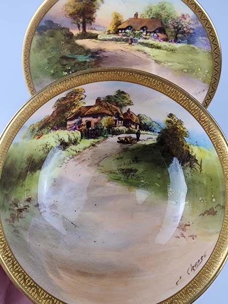 A collectable Royal Worcester Villiage Cottage scene porcelain cups and saucers of various locations and by various artists.