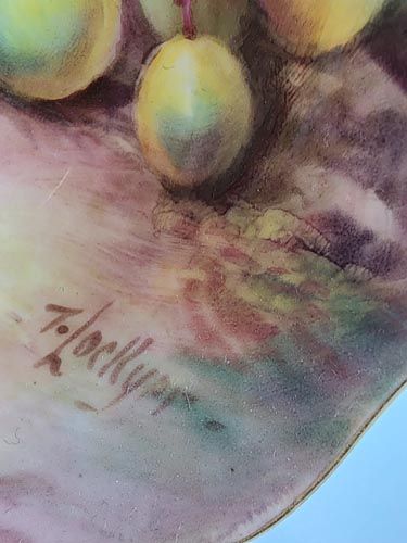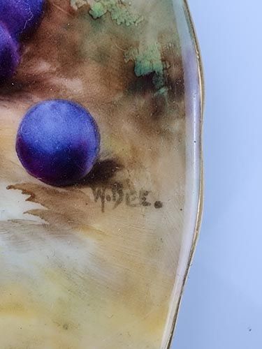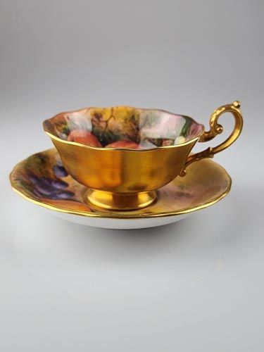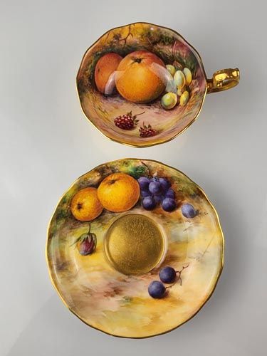 A nice Royal Worcester porcelain Duo: cups and saucer with hand painted fallen fruit pattern, signed Thomas Lockyer (cup), and William (Billy) Bee (saucer).