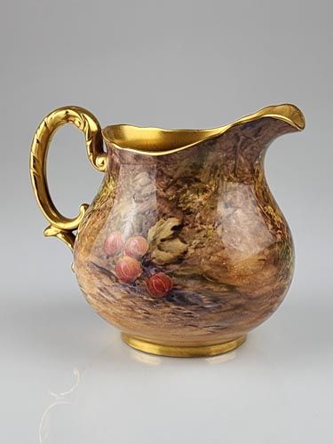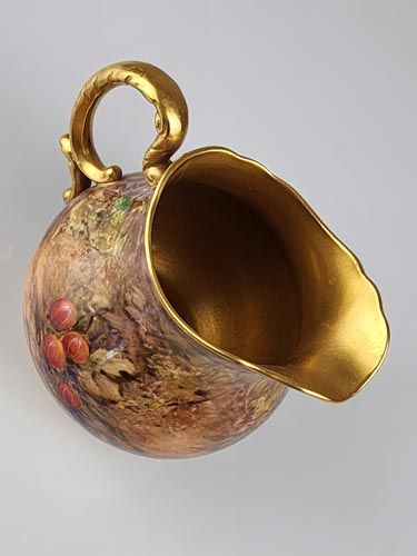 A Royal Worcester porcelain jug hand painted in the fallen fruit pattern with heavy gilt inside, signed.