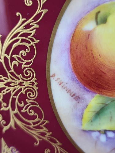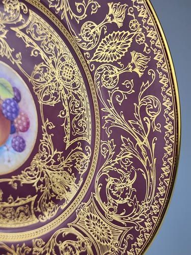 A wonderful Royal Worcester plate decorated with the fallen fruit pattern bordered with decorative gilt on maroon border.