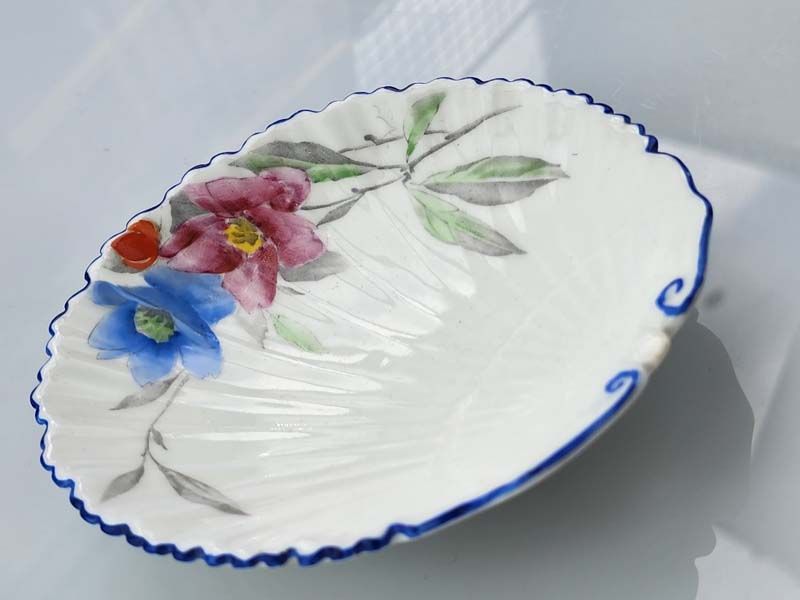 A lovely Shelley shell shaped bowl with pretty red and blue flower and blue pinstriped rim. Sides have a lovely ruffled shell like effect.