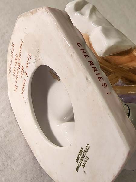 A figurine by Copelands Spode England, named Cherries, Cries of London after Francis Wheatley R.A. Registration number dates this to 1932.