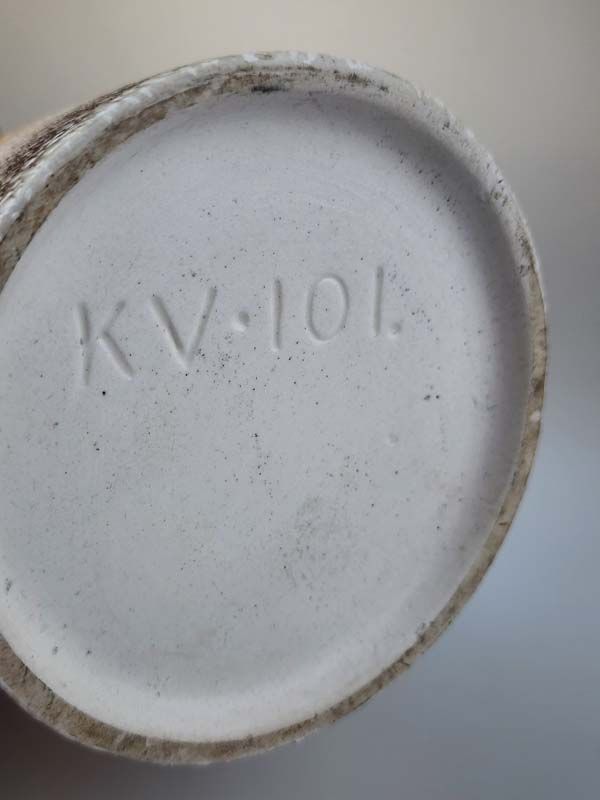 A Titian studios white vase with brown and orange bands, textured outer glaze, and wonderful angle cut lip.