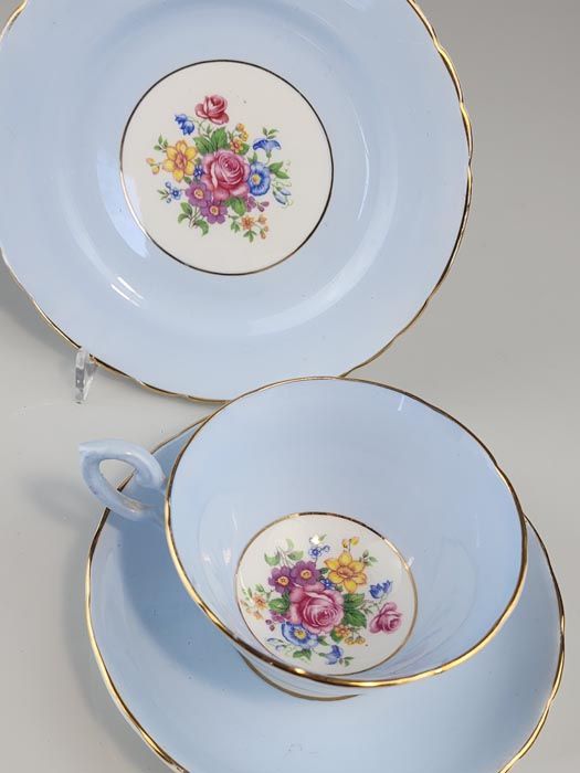 A nice Tuscan Fine English Bone China tea cup, saucer and side plate, in pale blue, gilt pinstripes and a posey of flowers to center of each pieces.