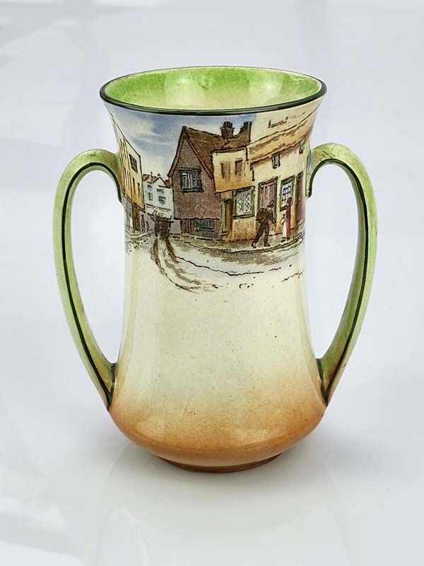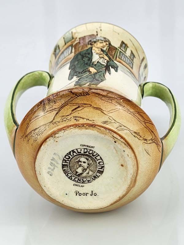A collectable Royal Doulton double handled vase from the Dickens ware series with the Poor Jo character.