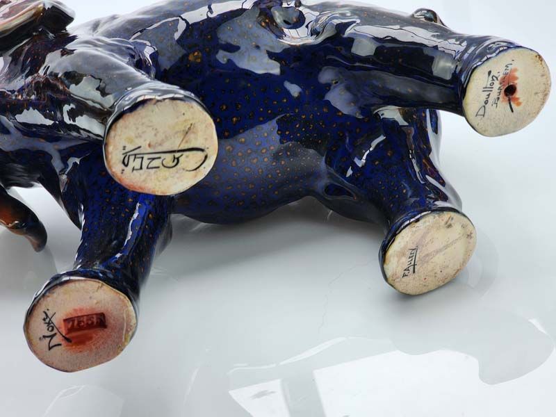 A superb large example of Elephant with raised trunk in salute, decorated with blue, purple and red Flambe. Signed on feet Noke F. Allen, SUNG, and DOulton Burslem.