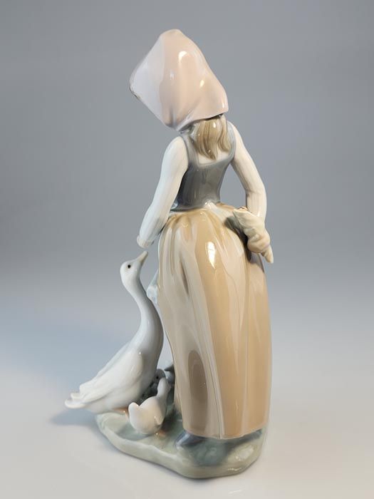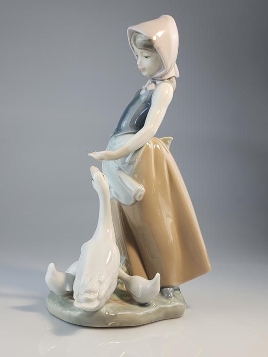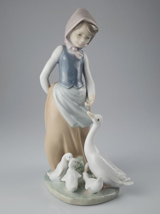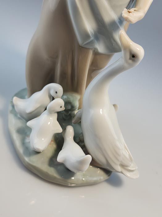 A Lladró brand porcelain figurine entitled 'How do you do?' (Snails for Ducks). This figurine, hand made in Spain, depicts a girl feeding ducks snails.