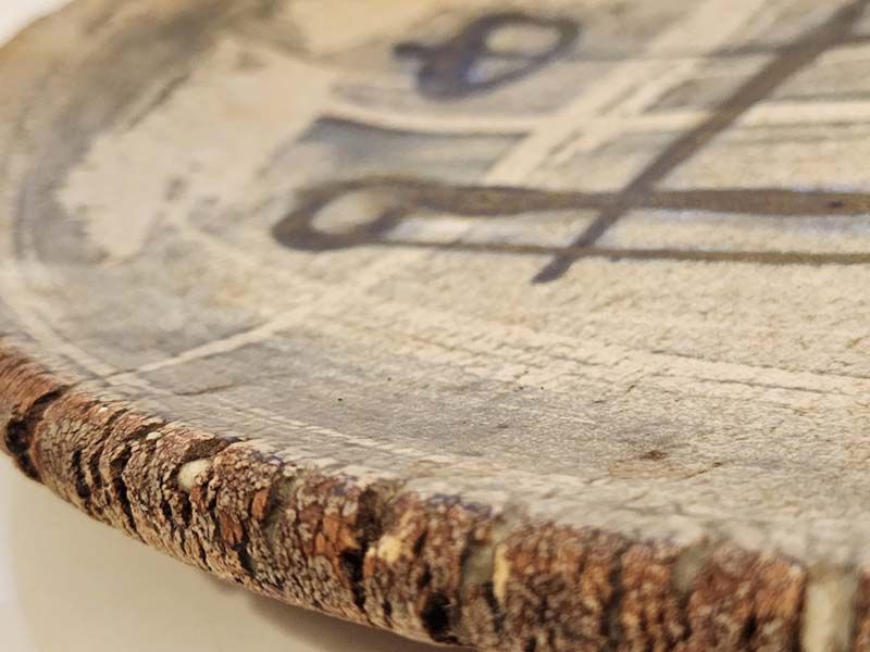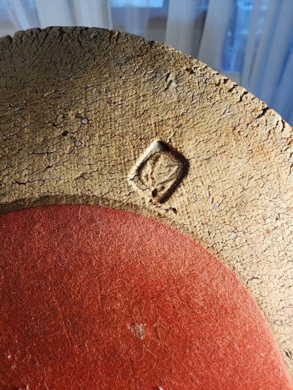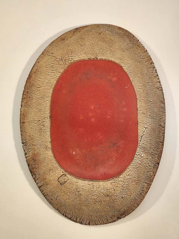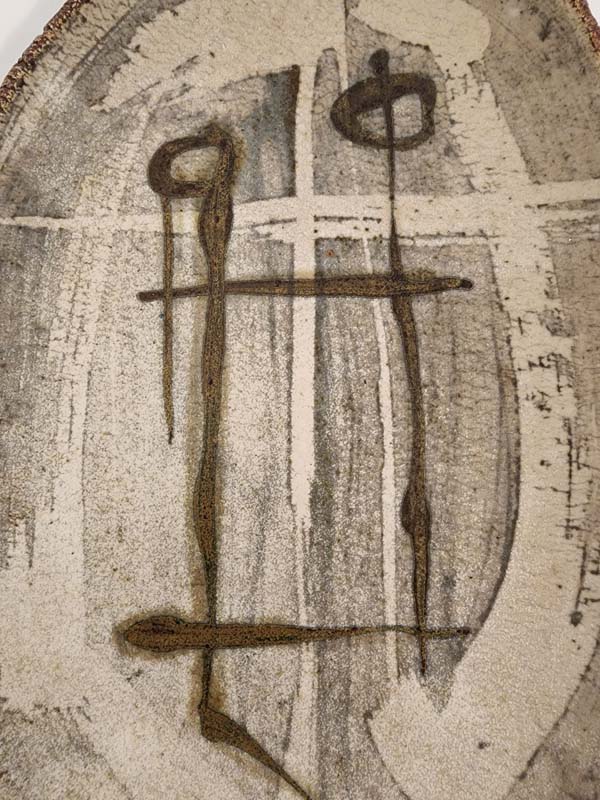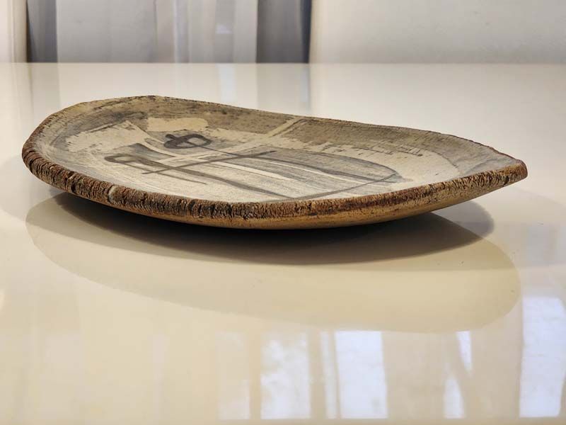 A special plaque pottered by New Zealand potter Doris Dutch and decorated by her artist husband, Ted Dutch. Backed with a red felt material.