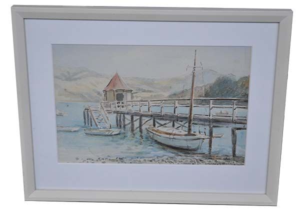 A nice water colour painting by Cranleigh Harper Barton of Daly's wharf in Akaroa.