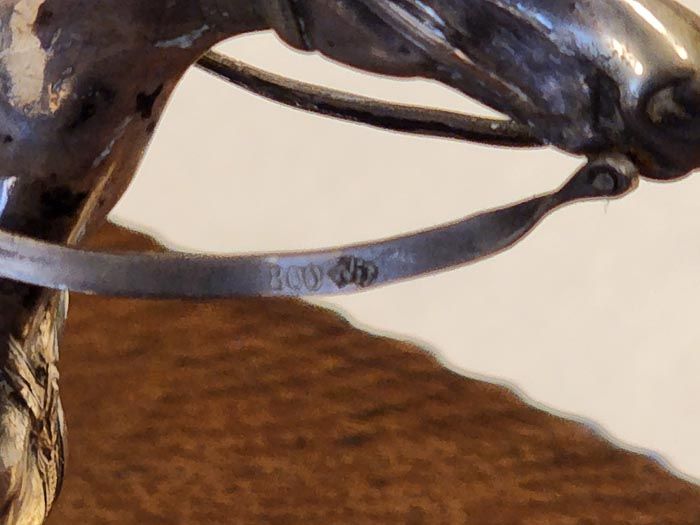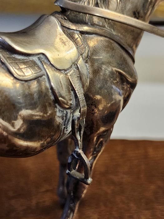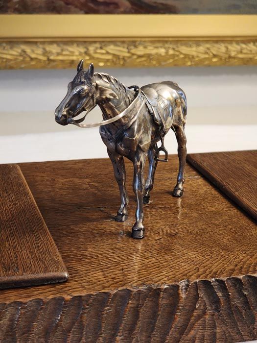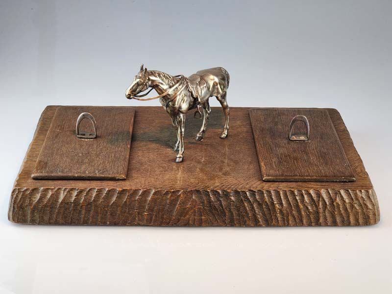 A very nice large 800 silver Desk set of a horse standing on Oak base. The 800 silver mark is to the horse reigns.