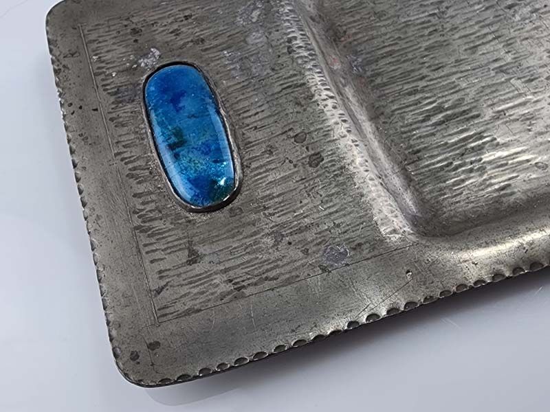 A nice Arts & Crafts Tudric style pewter tray with undamaged turquoise inserts.