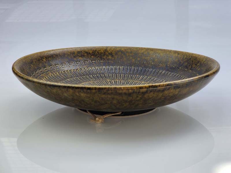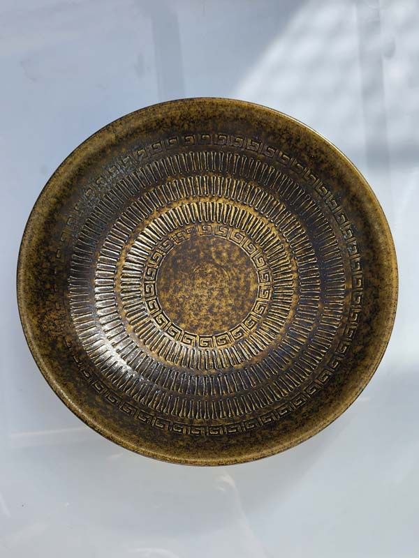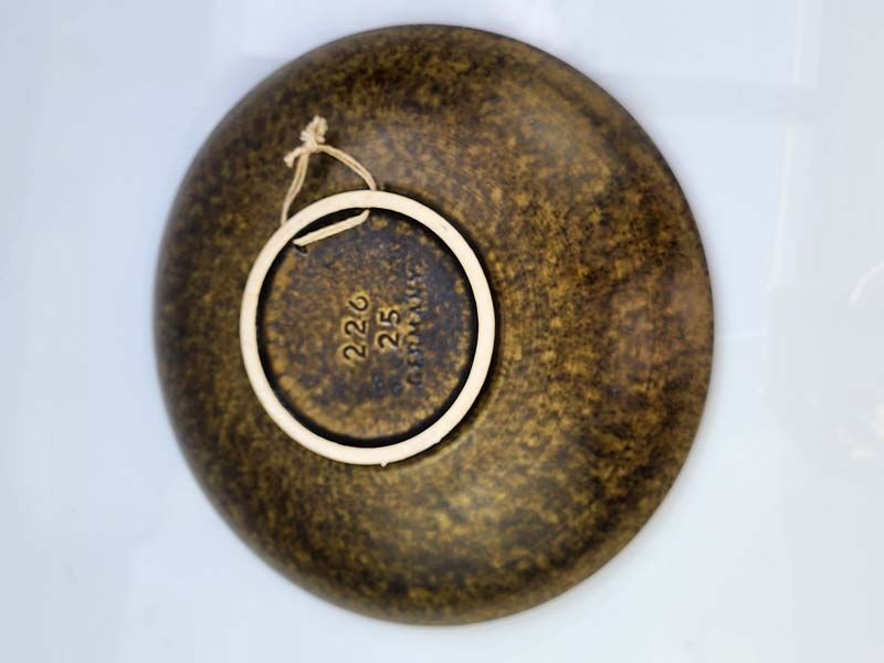 An ochre-green Dümler & Breiden plate wall plate. Patterned with impressed geometrical concentrical short lines with an overall ethnic/tribal feel to it. Dümler & Breiden omitted their D&B logo on the base of their products and only used the model from number and hight from the late 1970's onwards.