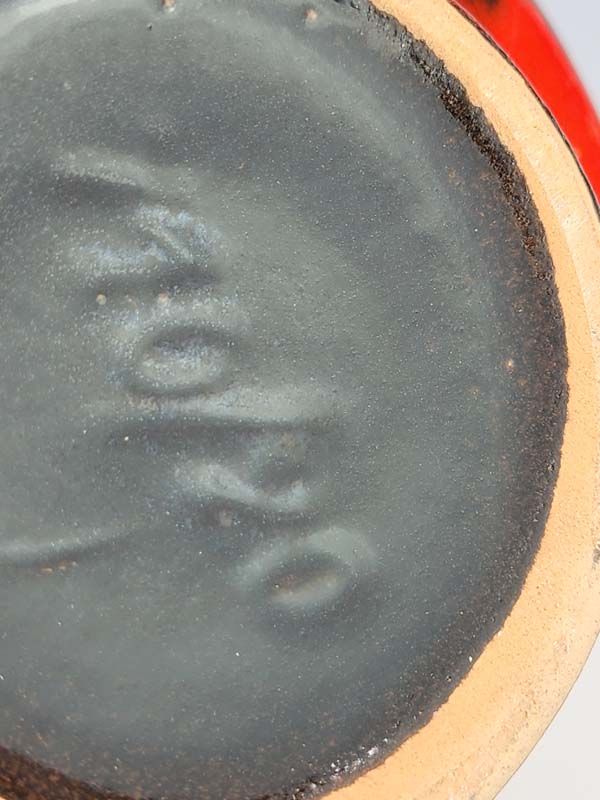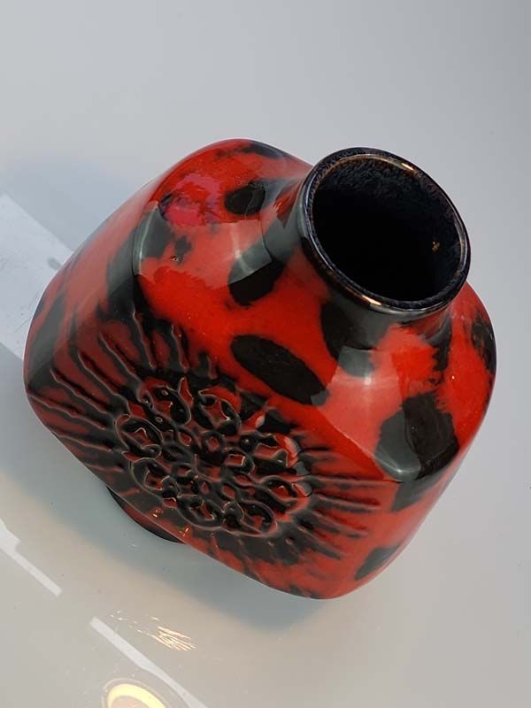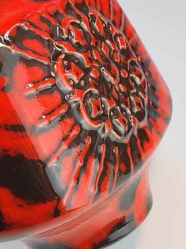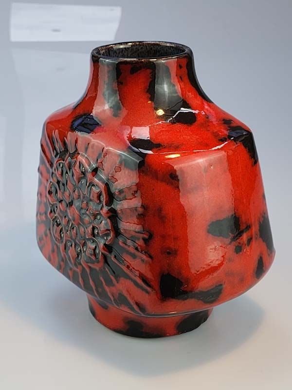 A superb red retro West Germany Pottery vase with lovely shape and sunflower decoration to front and back.